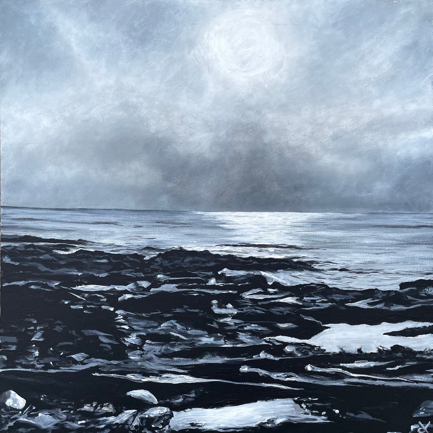 "Reflecting at Dawn" Giclee Prints - a beautifully rocky coastal scene and the sea reflecting the morning sun. Painted in high contrast greyscale tones.